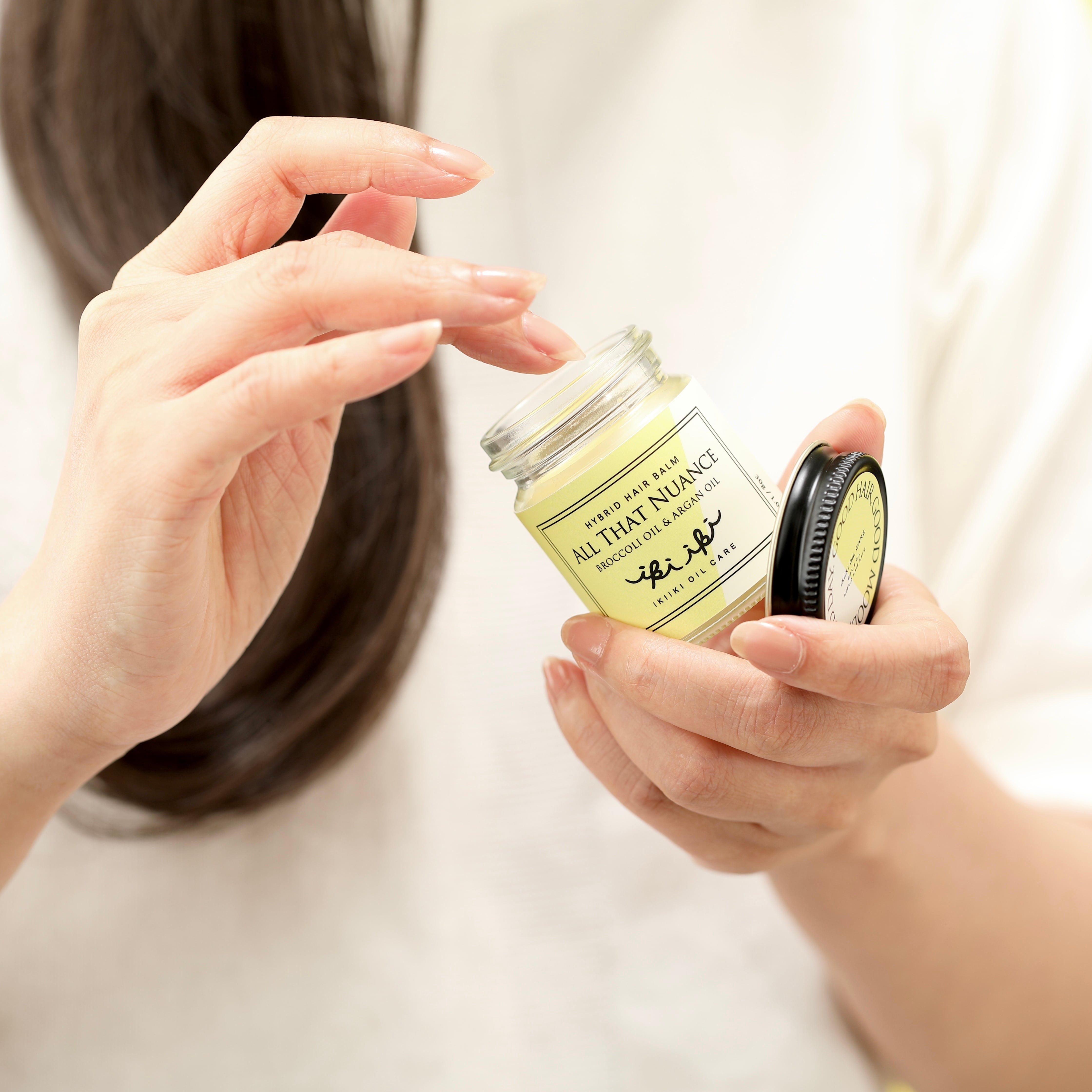 ワックスの軽めなホールド感と、オイルのツヤめきを一度に叶えるハイブリッドバーム。手の温度でとろけて、髪に自然なツヤと濡れ感を与えつつ動きを作り、サッとつけるだけでニュアンス感のあるこなれヘアが叶います。